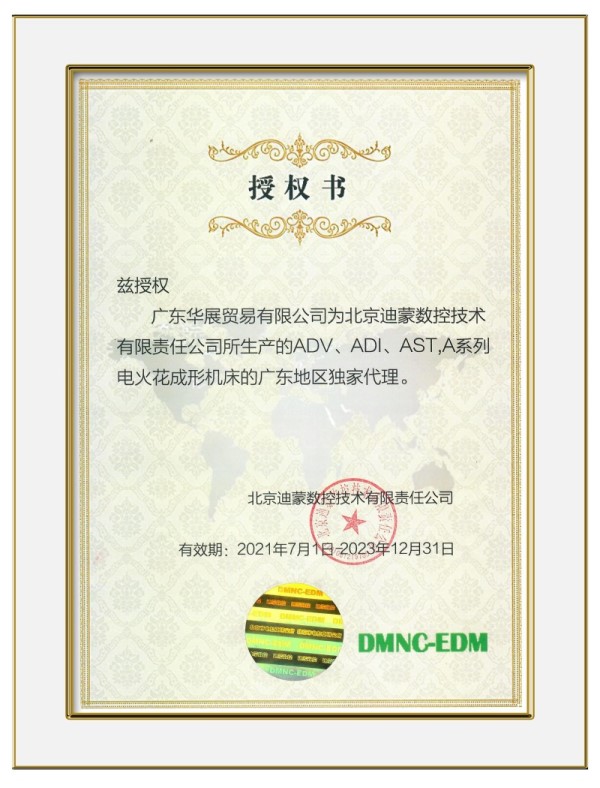 近日,北京迪蒙数控技术有限责任公司为广东华展颁发了新的总代理证书,高度肯定了广东华展为迪蒙数控[DMNC-EDM]品牌建设作出的努力,为迪蒙数控品牌收获的良好口碑感到欣慰,充...